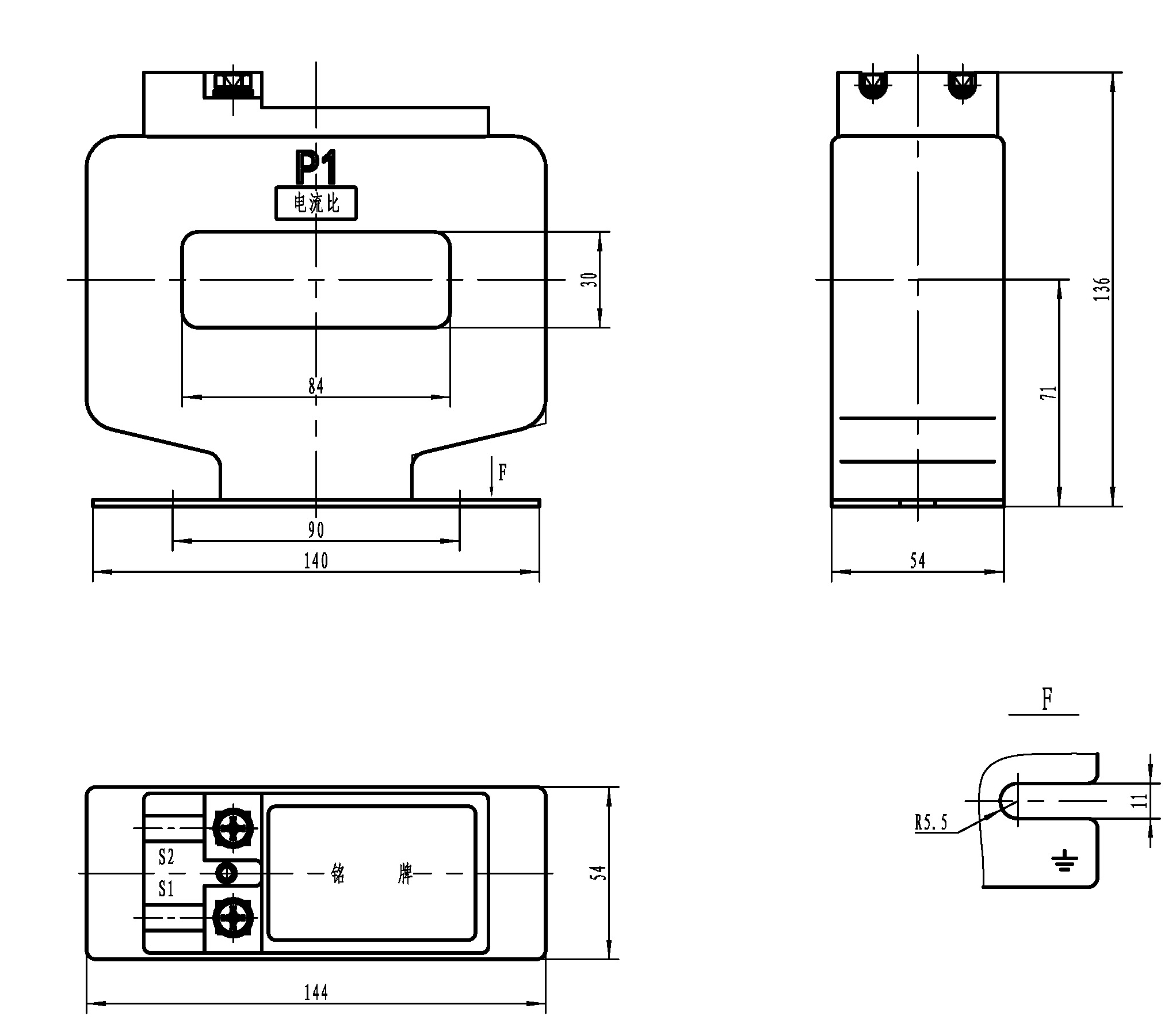 ●結構:電流互感器的鐵心為環(huán)形和矩形兩種。二次繞組沿鐵芯周均分布,采用環(huán)氧樹脂澆注為電流互感器外殼,電流互感器的設計為窗孔,供一次母排或電纜穿過。P1標記為一次進線端;P2標記為一次出線端;二次電流由S1流出端;S2為流入端,即為減極性。